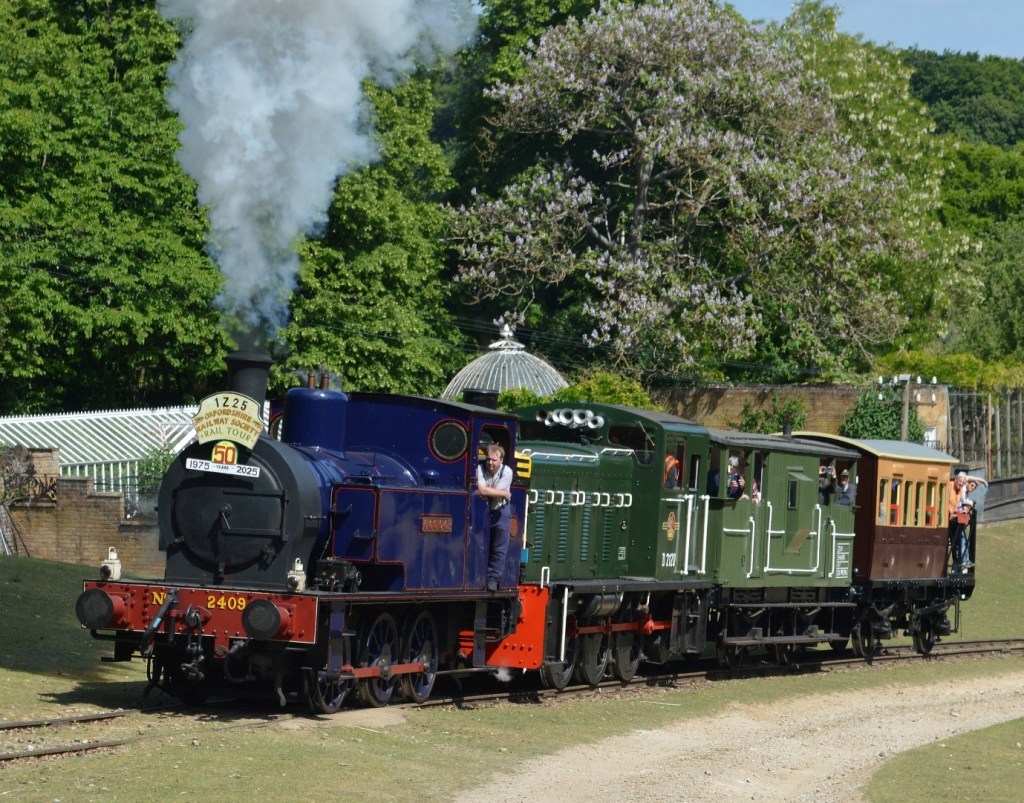 On the day, ex-BR Class 03 No. D2120 was providing the early motive power until it was joined in tandem by visiting steam loco “King George” No. 2409, constructed by Hunslet in 1942 and on loan from Didcot, the little engine not being powerful enough to pull two wagons up the challenging grade by itself. No. 2409 was substituting for the normally resident Hudswell Clark-built 0-6-0 No.31 which is currently under repair at Didcot.